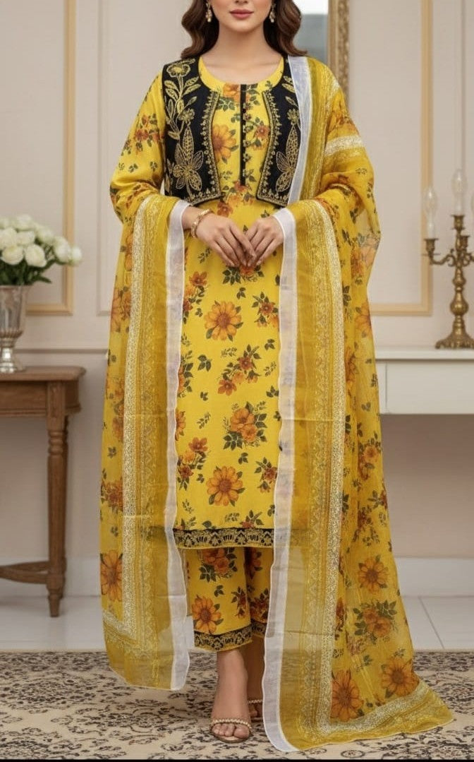 Elevate your everyday style with this elegant 3-piece suit, featuring a beautifully printed shirt paired with a matching palazzo and dupatta. Crafted for comfort and grace, it blends traditional charm with modern sophistication — perfect for casual wear or semi-formal occasions. ✨
