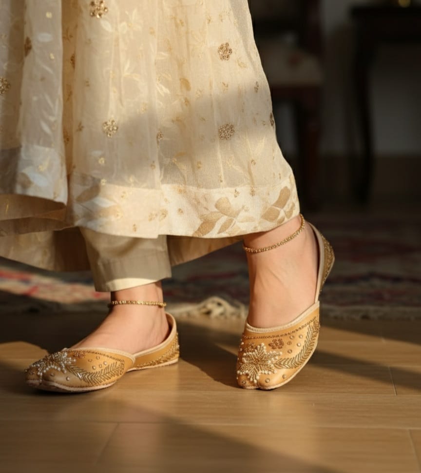 Elevate your bridal look with our handcrafted Golden khussa — a timeless blend of elegance and tradition. Each pair is beautifully adorned with intricate embellishments and detailed handwork, making it the perfect complement to your special day. Crafted on premium sheet fabric for comfort and durability, this khussa combines classic artistry with modern grace.