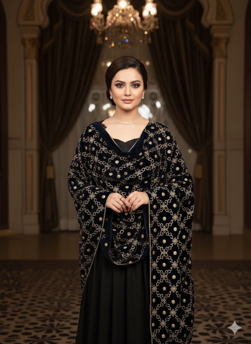 Wrap yourself in royalty with our Dark Blue Velvet Shawl, a luxurious piece crafted for timeless elegance. Made from plush velvet in a deep maroon hue, this shawl features intricate golden zari embroidery arranged in elegant diagonal patterns and ornate borders — a true nod to traditional craftsmanship.