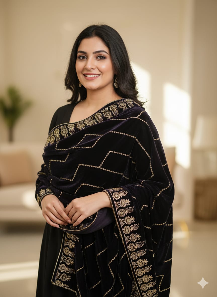 Wrap yourself in royalty with our Deep Purple Velvet Shawl, a luxurious piece crafted for timeless elegance. Made from plush velvet in a deep maroon hue, this shawl features intricate golden zari embroidery arranged in elegant diagonal patterns and ornate borders — a true nod to traditional craftsmanship.
